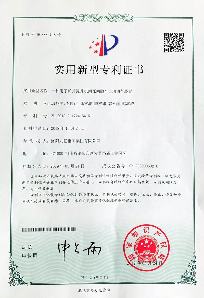 閘瓦間隙全自動調(diào)節(jié)裝置證書